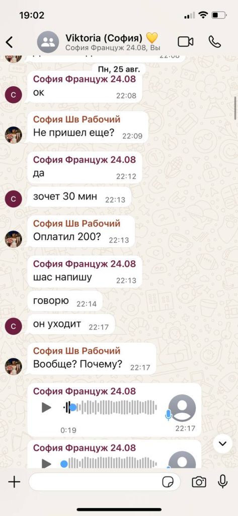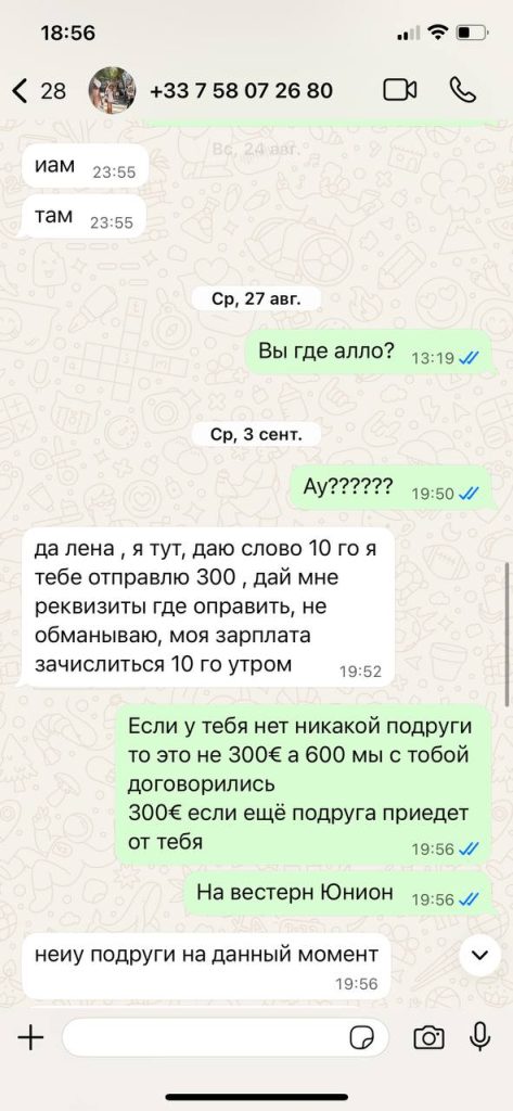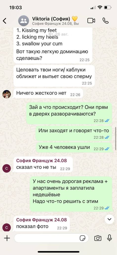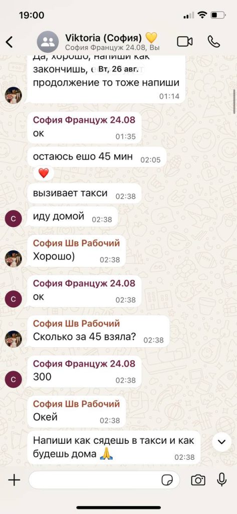 Приехали они с подругой на попутке из Франции (за 20€). В первый день с дороги устали и отменили клиентов. Второй день от Софии ушло 5 человек, как сказали в чате что несоответствие фото и девушки (что сказал абсолютно каждый гость). Вечером она уехала на ауткол и получила от гостя 650франков (815$)