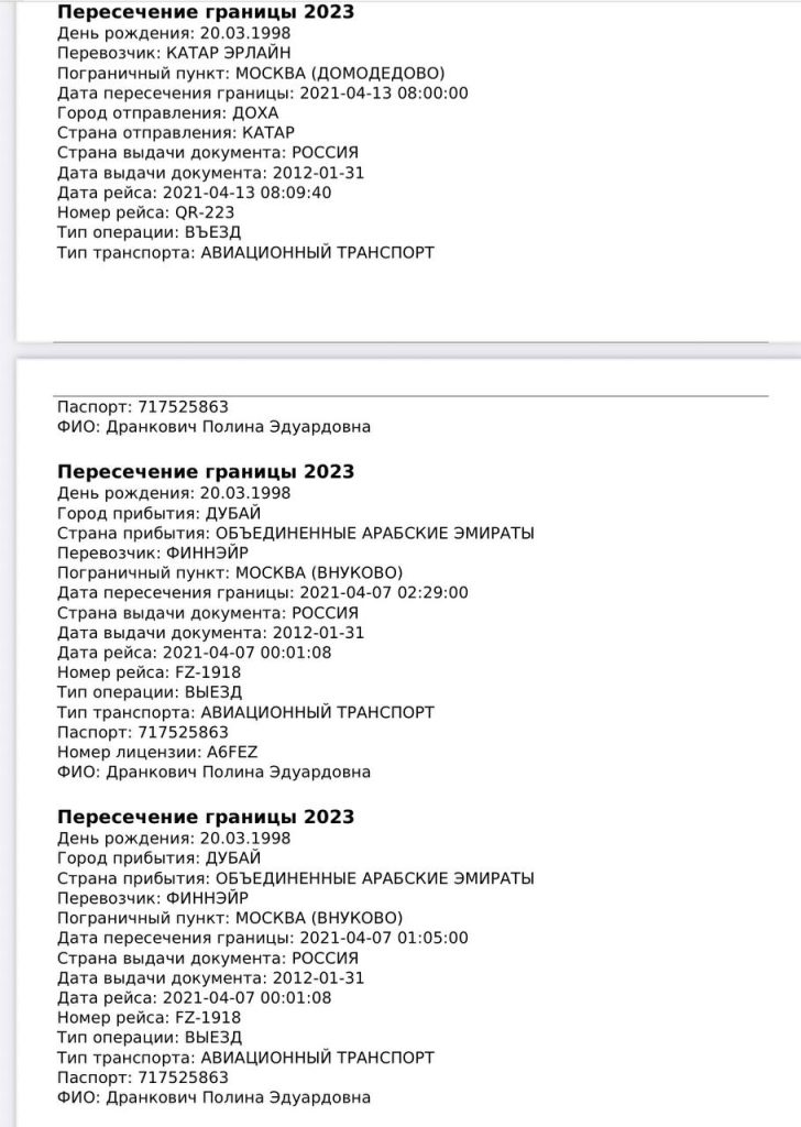 Регулярно летает в Дубай, в Катар. Говорила, что с родителями, но те были в ОАЭ один раз — 23.04.2022, и вместе с ней точно не летали. А значит — это были не отпускные туры, а «рабочие».