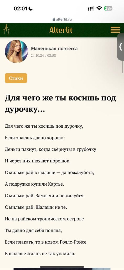 Рассказывает, что работает главным редактором в какой-то “Альтерлит”, но максимум ей платят 30 тысяч раз в полгода за удаление комментариев. Втирает всем, что была номинантом на премии “Молодой поэт года 2022”, но её имя нигде не числится. Пишет странные стишки на тему проституции.