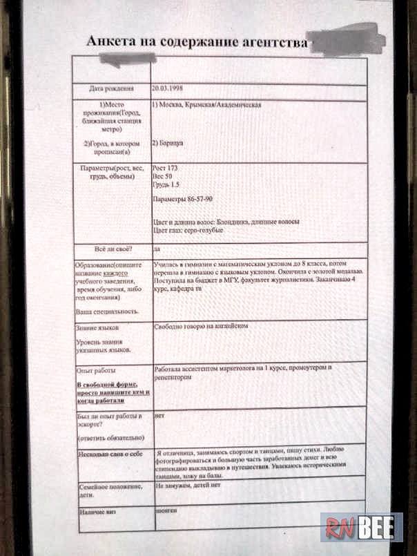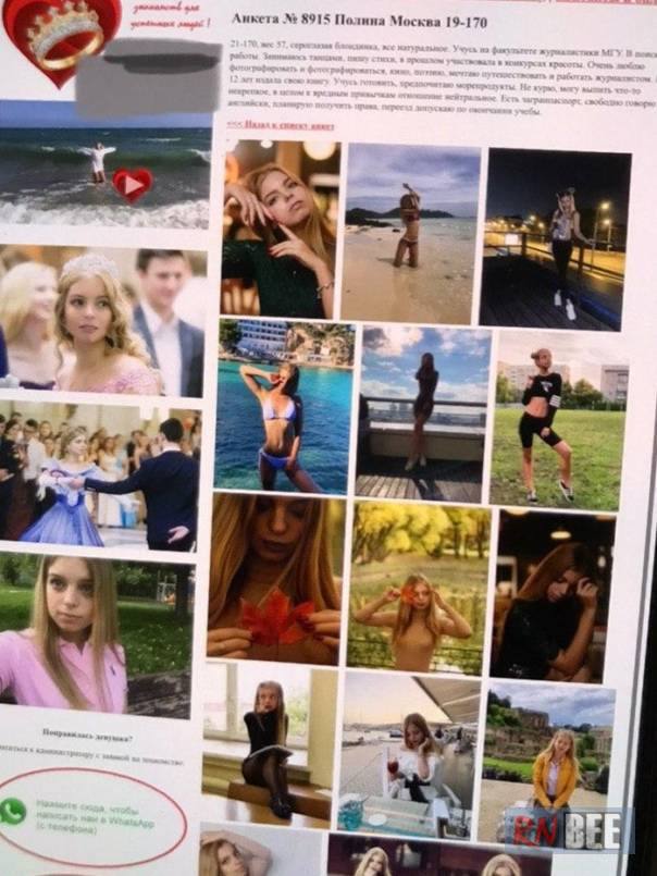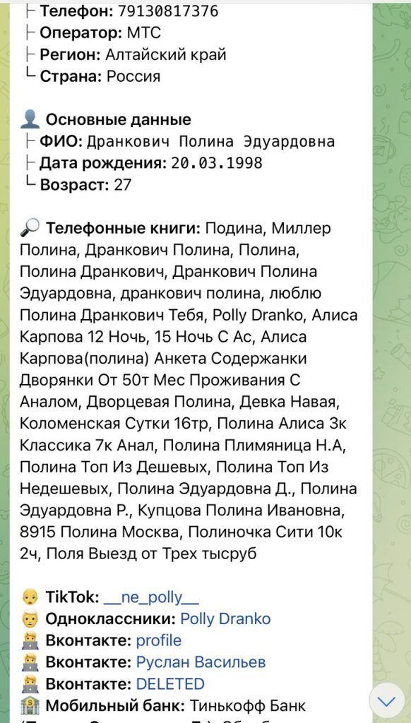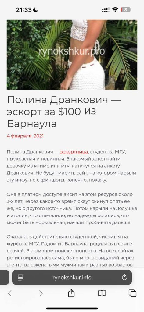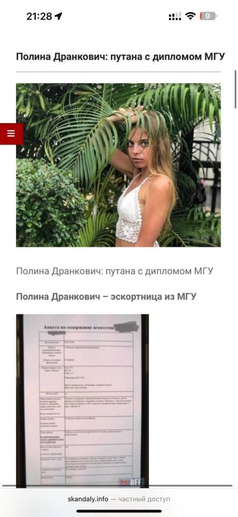 Полина Дранкович Эдуардовна, 1998 года рождения, ей 27 лет, живёт в Москве. Берёт от 3000 рублей в час, 7000 — за анал, ночь — от 10 тысяч. У неё очень странные пропорции — длинное туловище, пересушенное тело, лицо с бобриными чертами.