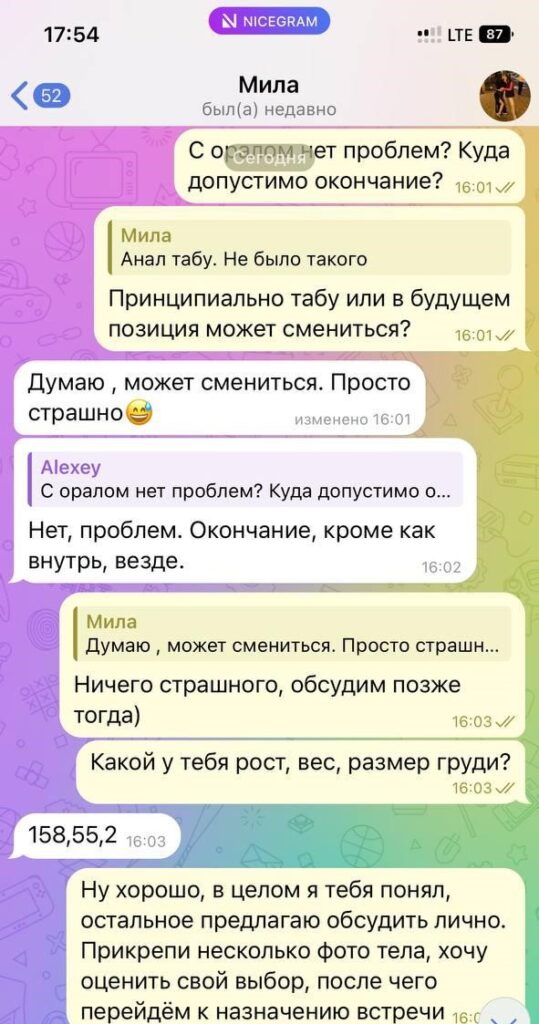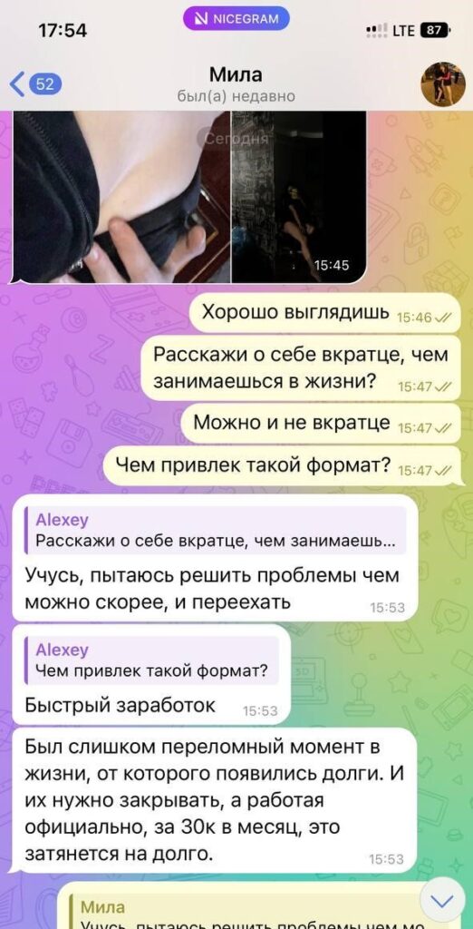 Была не против рассылки и публикации, хотя могла удалить за сумму, которую за неделю тратит, так как считает что деньги важнее всего, а реклама ее секс-услуг принесет ей доп.заработок.